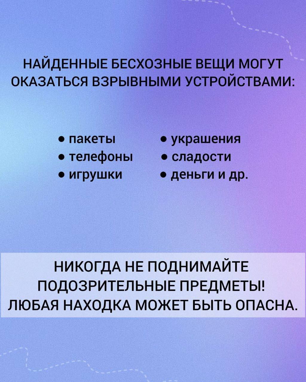 Никогда не поднимайте на улице бесхозные предметы — пакеты, телефоны, игрушки, украшения, сладости, деньги и другие вещи.