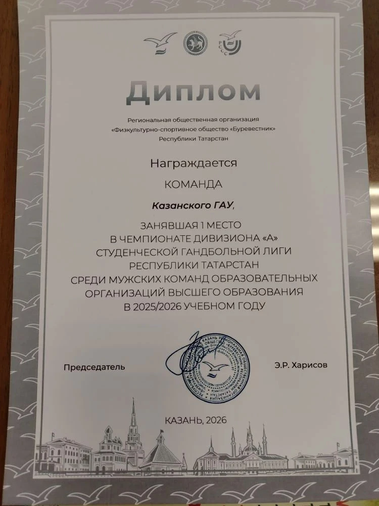 С 24 февраля по 17 марта в Республике Татарстан проходил чемпионат по гандболу среди мужских команд образовательных организаций высшего образования. В дивизионе «А» студенческой гандбольной лиги РТ сборная Казанского ГАУ показала настоящий мастер-класс и уверенно заняла 1 место, обыграв всех соперников!