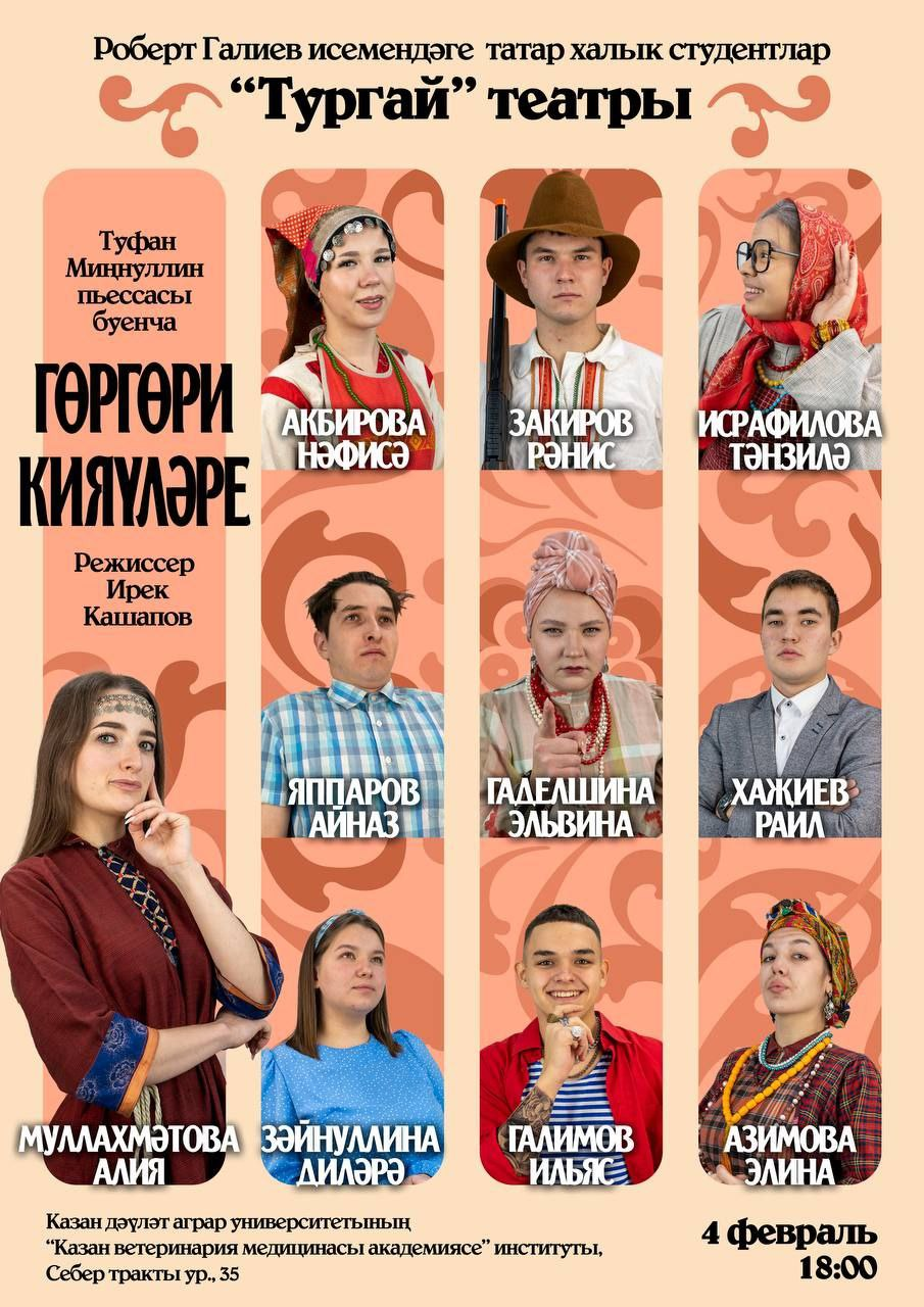 Туфан Миңнуллинның атаклы «Гөргөри кияүләре» пьесасы буенча куелган спектакльнең кабат күрсәтелүен шатланып белдерәбез ( режиссеры — Ирек Кашапов). Сезне якты хисләр, җанлы юмор һәм татар театрының чын атмосферасы көтә. Бу гаҗәеп вакыйганың бер өлеше булу мөмкинлеген ычкындырмагыз! Датасы: 4 февраль Вакыт: 18: 00 Урын: КВМА институты (Себер тракты ур., 35) «Тургай» театрына ярдәм итәргә һәм […]